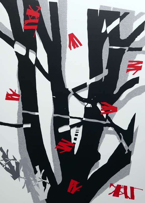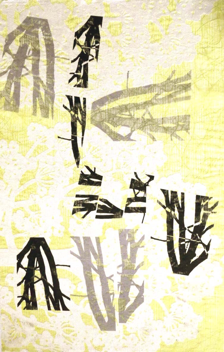Zeitläufe 1 | 76x64 cm | bemalter Stoff ein Winter draußen + Absperrband | Scan + Digitaldruck auf Bütten | 2019